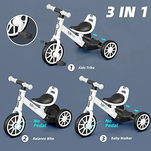 - ? BABY’S FIRST BIKE GIFT: Our toddler bike is the best birthday gift for baby to learn how to ride a bike. Compared with other tricycles, XJD tricycle has additional lift seat, adjustment rear wheel and remove the pedals function. The seat adjustable height rang is 11 to 12.6in(28-32cm). The back wheels’ adjustable wide range is 7.9 to 14.2in. Pedals can be stored under the seat , much more convenient and not easy to lose. Perfectly suitable for growing with baby