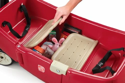- A wagon with with 2 seats that flip into a flatbed or table. Easy access doors for kids to open and close.