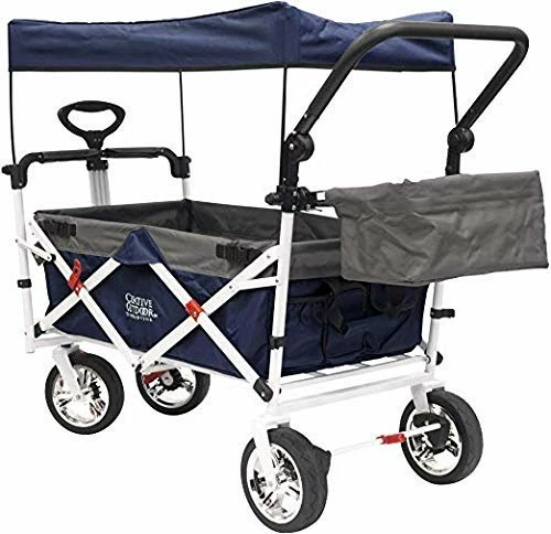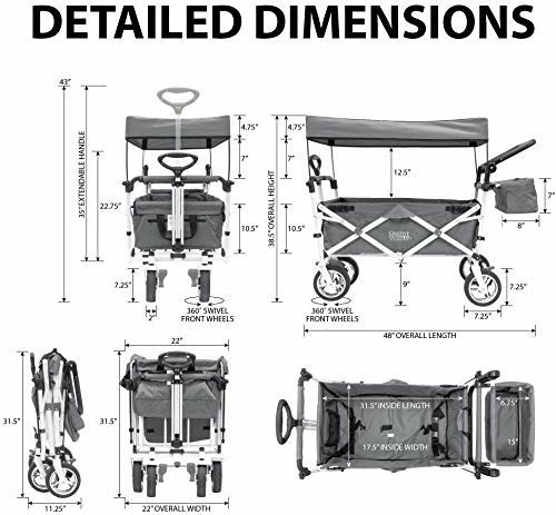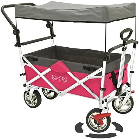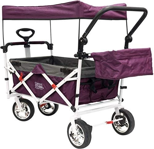 Love, love this wagon!! It is so great to use as a Nanny, single mother, and Aunt. Real sturdy and since it folds up it basically lives in the car so we can always have it with us. The few times I take it out, I can slip it into the coat closet. Kid’s love to have shade, bigger kid’s enjoy pushing the smaller one’s since it has that option. Grateful for the seatbelt’s and little pockets to hold odd’s and end’s. So glad for durable big wheels. The only reason I am not giving 5 stars is because the 2 back wheels are together in the middle and not on the outside like the other two, so IT CAN TIP OVER. I figured out how to turn it sharply without it tipping but when the kids pull/push I always walk on the side just incase. Also be careful on uneven ground. Everything else is so wonderful, thank you!!
