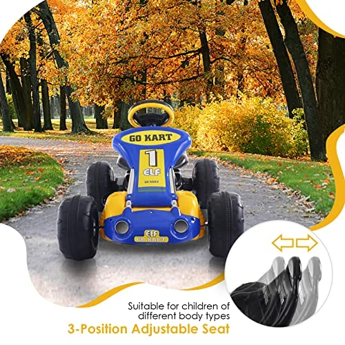 - γErgonomic Seat for ComfortγThe go kart features 3 adjustable positions to suit children in different heights to ride. Adopting ergonomic design, the pedal go kart is built with a high backrest to provide a comfortable sitting and riding experience, allowing your kid to relieve back muscle fatigue.
