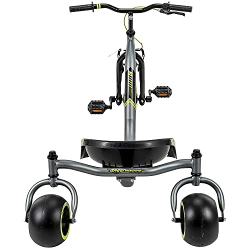 The green machine is a substantial machine. It is definitely big enough for my 10 year old to enjoy for a few years and so far seems pretty rugged. I am not crazy about the placement of the levers, they seem to be “in the way” a bit. However, after a few minutes my daughter got used to the steering and was having fun.It is a little difficult for her to get the machine going if she has to stop, then restart when she is on an incline, but that isn’t the worst thing in the world. I got a huge discount when I bought it so I am very happy with the bang for the buck!The front wheel had a cut when we bought it so we had to wait for a replacement bike, but customer service was very accommodating and made the exchange fairly easy, and quick!