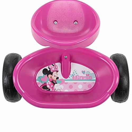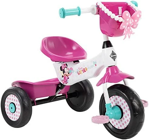 - Cute Style: Disney’s Minnie Mouse decorates the white steel kid’s trike frame; plastic wheels feature pink polka dots; pink handlebar basket features Minnie’s bow