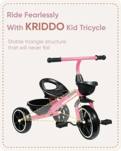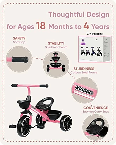 - TODDLER TRICYCLE โ KRIDDO kids tricycle is designed for 18-36 month toddler girls & boys who are curious and exited to explore the world, it helps to develop kids’ steering skills, steering and coordination at an early age. KRIDDO kids trike for 2 year old let your kids enjoy riding and gain confidence, as well as develop muscle strength, itโs a fun gift for your little ones.