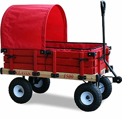 the wagon looks very high quality on line but the wagon is not at all and I should know I’m a Quality Inspector!! the side rails are flimsy and the black plastic connection points are missed drilled and the in the corners the sides are to short witch makes you have to nearly break the wood to get them together. there packing skills are horrible, the rails are loose in the box, witch caused on of the wood panels to rub on the inside of the box causing the paint to rube off. there is no protection foam in the box witched caused the some minor damage to the wood bottom structure. and I would return it but my family needs it for a zoo trip in 9 days so I am going to spend the week end fixing every thing. my advice build your own if you can, I wish I would of now. or buy a better build wagon you can see in person not one on line that miss leads you.Pros:pads are nicesteering good and beefyCons:wood quality packagingside panels are not long enough and the wood is thin and cheepTHIS IS NOT WORTH THE NEARLY 300 F’ING DOLLARS I PAID!!!!!!!!!!BUY AMERICAN, NOT CANADIAN!!!!!!!#CARTWHEELS # RADIO FLYER