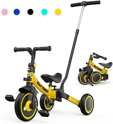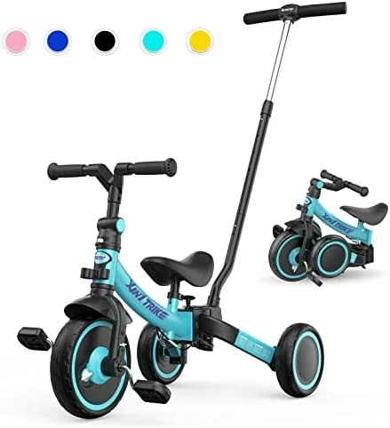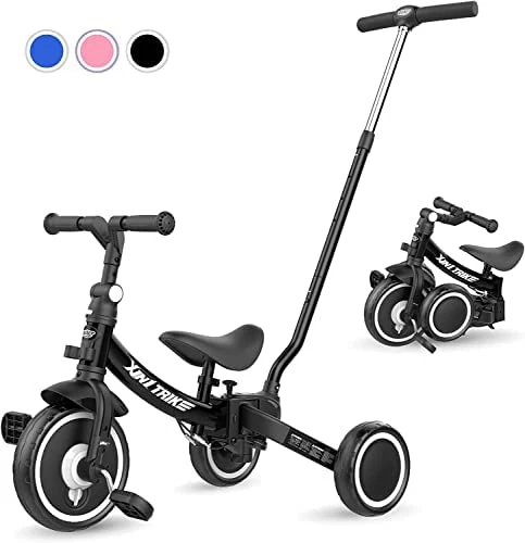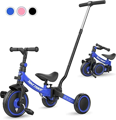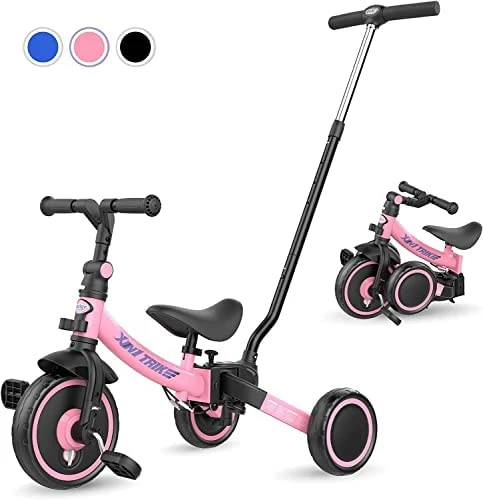 PLEKER 7-in-1 Toddler Tricycle with 5-Height Parent Steering Push Handle for 1-5 Years Old, Foldable Kids Trike, Toddler Bike with Wheel Clutch, Larger Wheels, Removable Pedals, Height Adjustable Seat (Blue, 7 in 1). I love that this bike will grow with my grandchild and I won’t have to buy a new bike every few years as she transitions from 4 wheeler to training bike, etc. 5 adjustable heights scooter for ages 1-5. Simple assembly and easy for kids to use. I recommend this item.